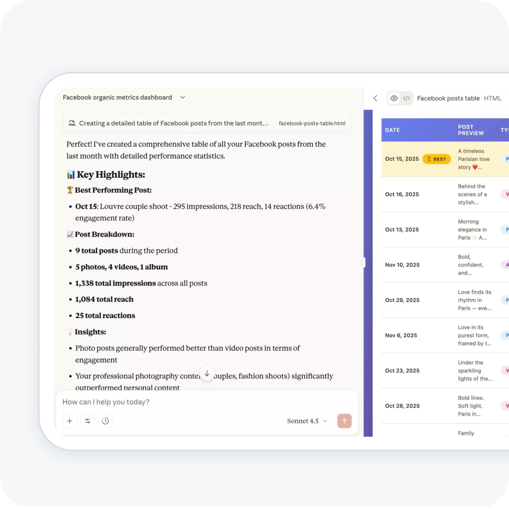 Connect your data to ChatGPT, Claude, or other AI chats to unlock deeper insights and create visual summaries in seconds.
