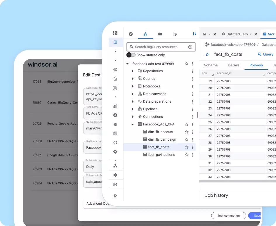 Automatically pull data from 325+ platforms and send it to AI assistants, spreadsheets, warehouses, and BI dashboards with the Windsor.ai connectors.