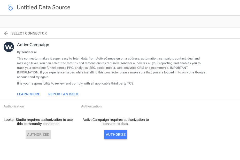 Select the Windsor.ai ActiveCampaign Looker Studio Connector. Click “Authorize” and log in with your Windsor.ai’s credentials. You will be redirected to the connector again. Choose your ActiveCampaign account and click “Connect.” Then, click “Create Report.”