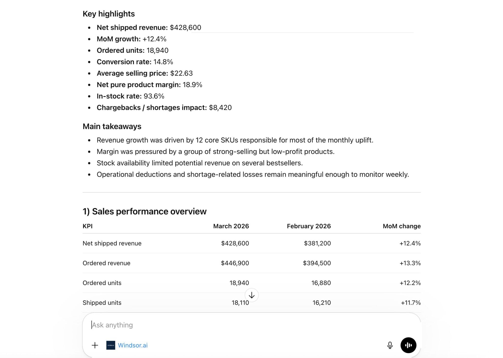 Connect Amazon Vendor Central to ChatGPT via Windsor.ai to get instant AI insights into your sales, inventory, and demand trends. Explore key use cases:
