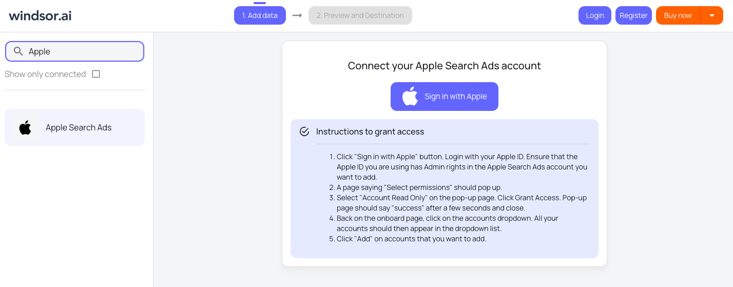 Choose Apple Search Ads as your data source and grant access to Windsor.ai.