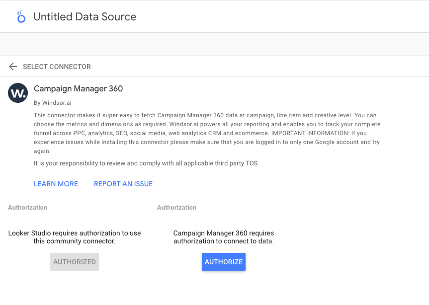 Select the Windsor.ai Campaign Manager 360 Looker Studio Connector. Click “Authorize” and log in with your Windsor.ai credentials. You will be redirected to the connector again. Choose your Campaign Manager 360 account and click “Connect.” Then, click “Create Report.”