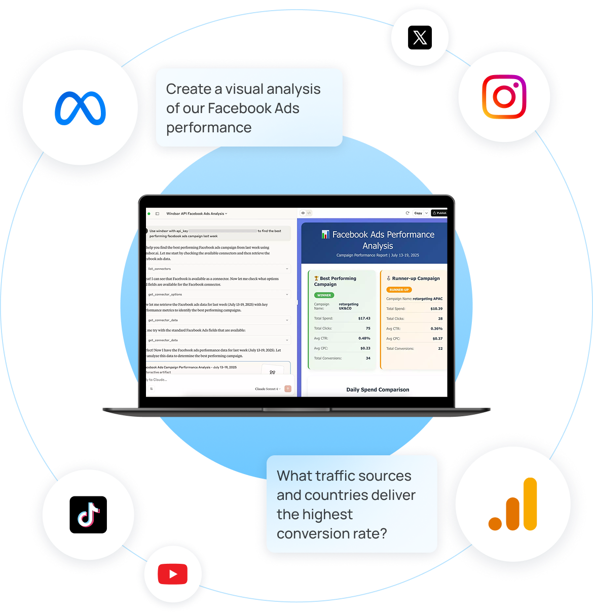 MCP automatically collects and normalizes data from all sources connected to your Windsor account, generating instant summaries, deep insights, and optimization recommendations.