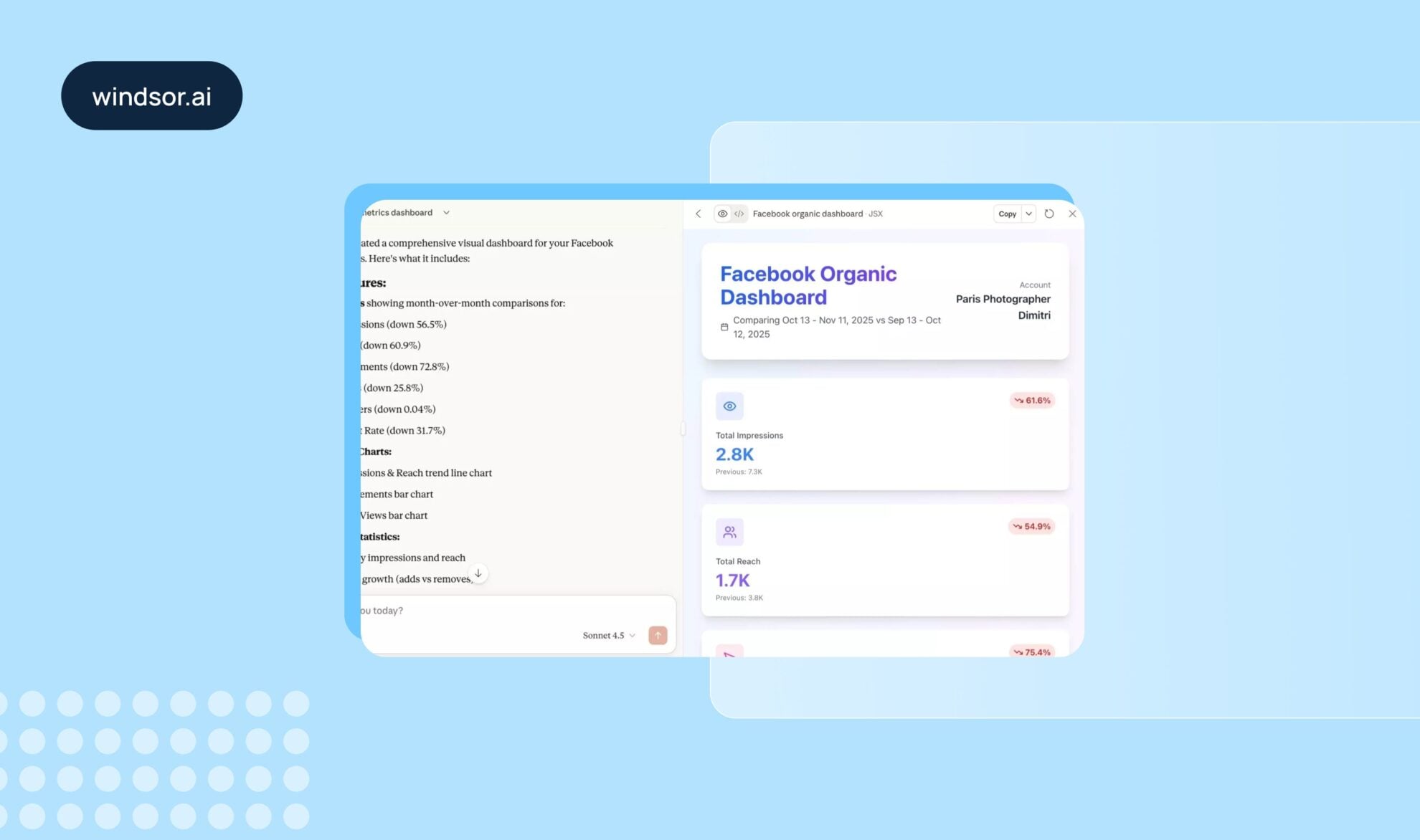 For instance, using Windsor’s MCP, you can deeply analyze different aspects of your business by writing prompts like “Summarize my key performance indicators across Facebook Organic for the last month.”