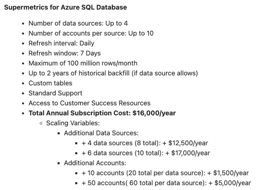 - Along with that, Supermetrics pricing changes unexpectedly. Renewals and feature access can shift, forcing 2x–4x price hikes with just one week’s notice to keep existing setups.