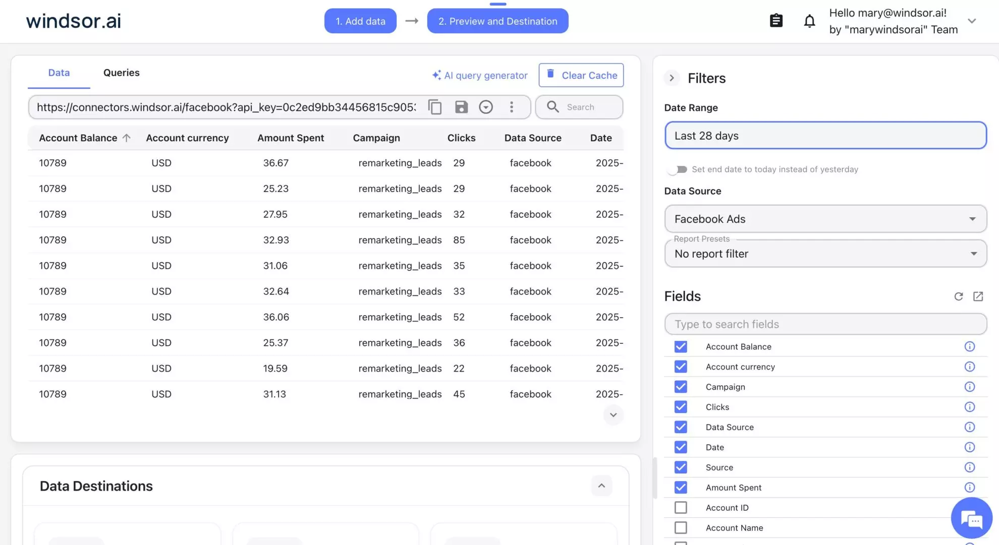 Before sending data to a destination, you can preview the dataset right in your Windsor.ai dashboard to verify that all metrics align with your original source reports.